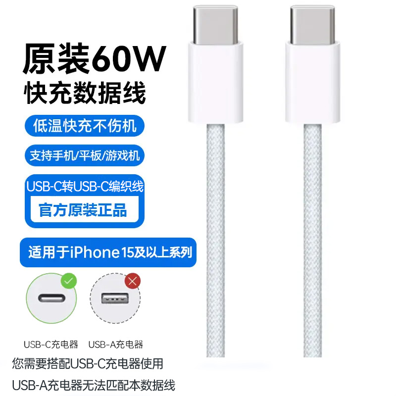 【适用iPhone 17系列】苹果 原装 60W USB-C转USB-C 手机/平板/笔记本电脑编织数据线